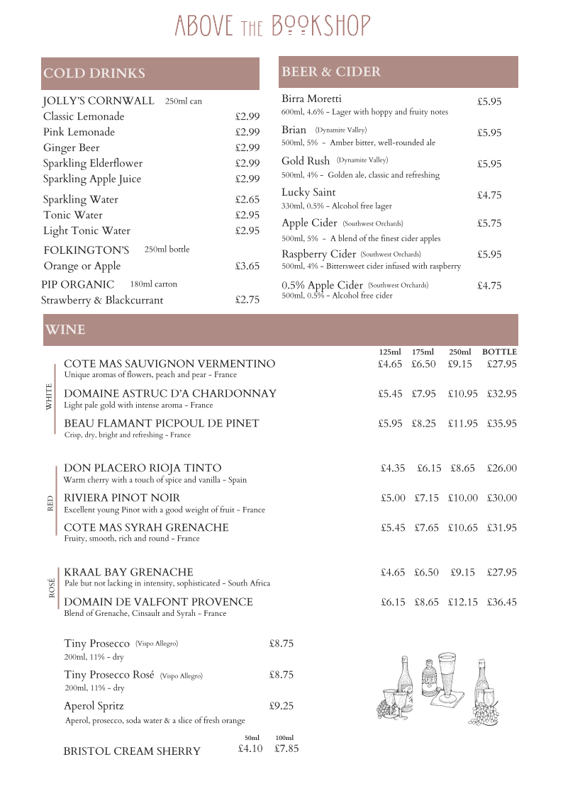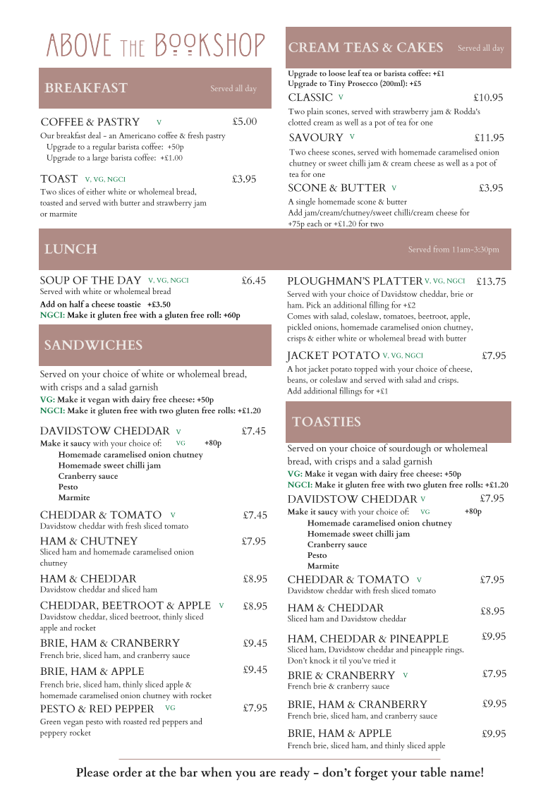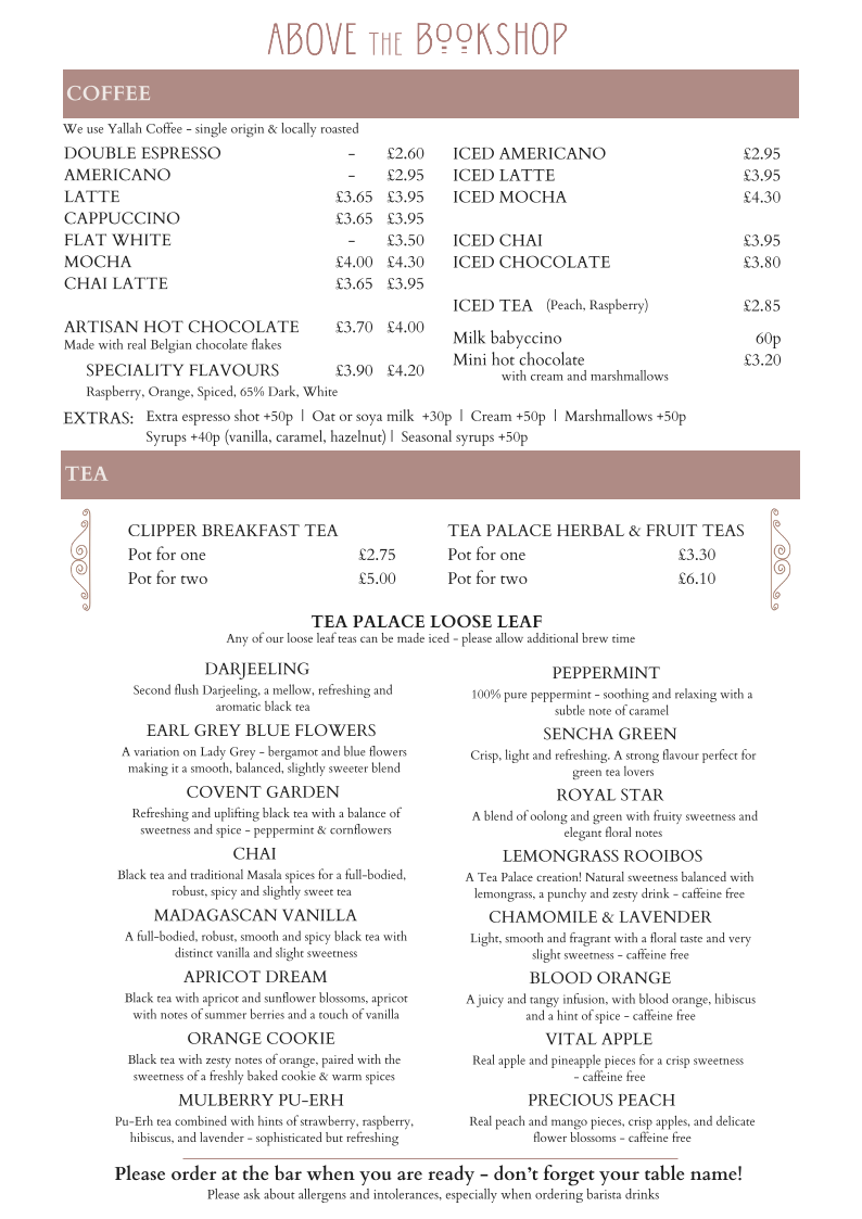 The menu at Above the Bookshop offers a selection of food and drink items suitable for coffee breaks, light meals, or afternoon treats. It is structured into distinct categories to provide a clear overview of available options.