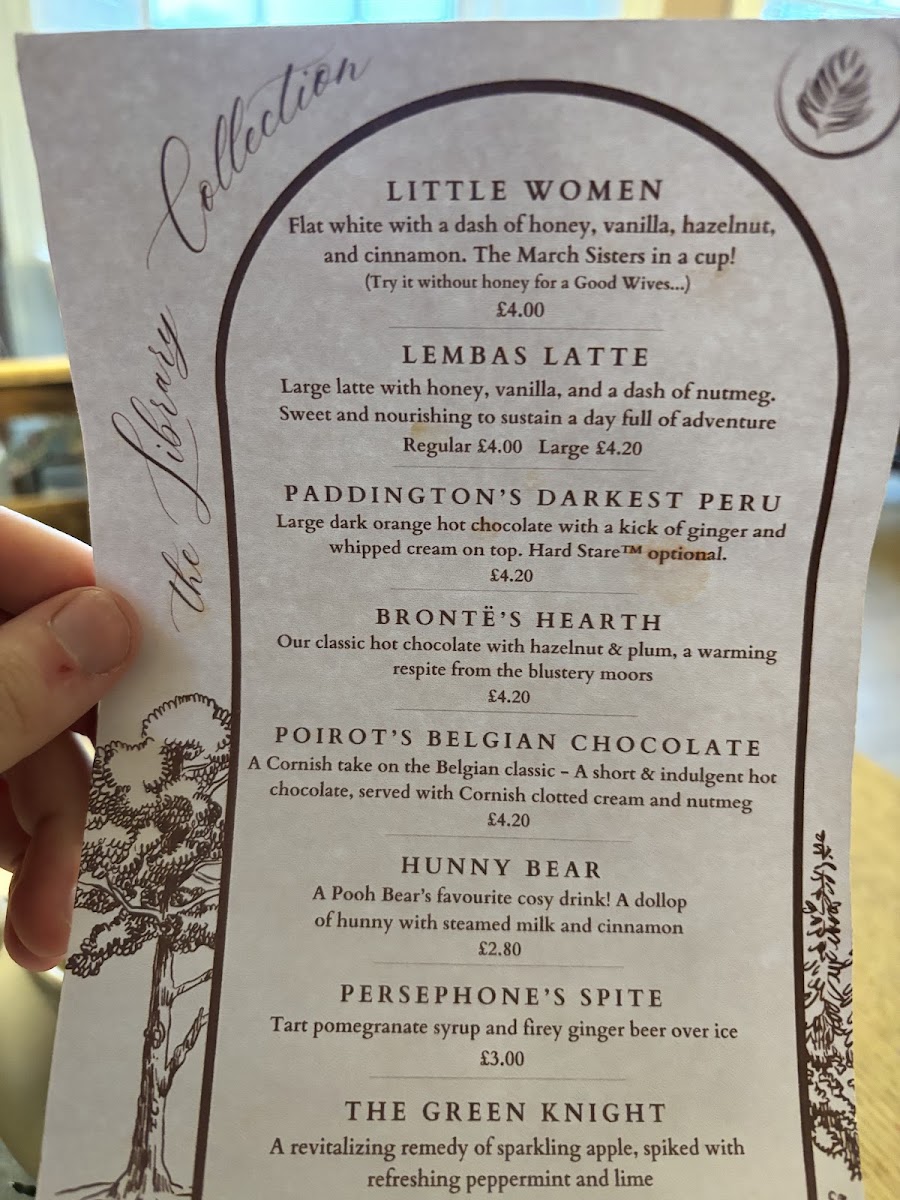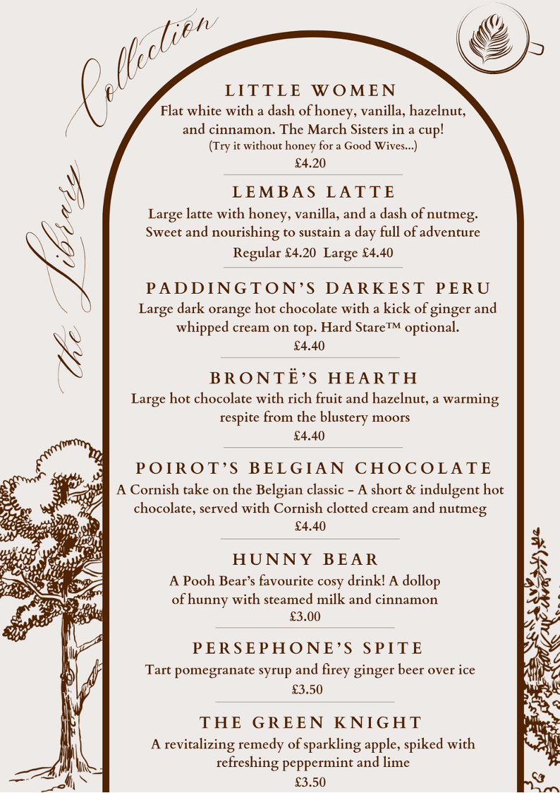 The Library Collection: This category presents specialty hot drinks inspired by literary themes. It includes flavored coffees such as flat whites and large lattes infused with honey, vanilla, spices, and nutmeg, as well as hot chocolate with added ginger and whipped cream.